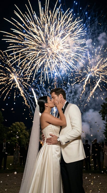 A complex image-to-image prompt for Nano Banana 2 to generate an epic, cinematic wedding kiss scene under massive fireworks. The prompt requires preserving the exact identity of the uploaded couple and specifies dramatic low-angle composition, dynamic lighting from the fireworks, and maximum realism.