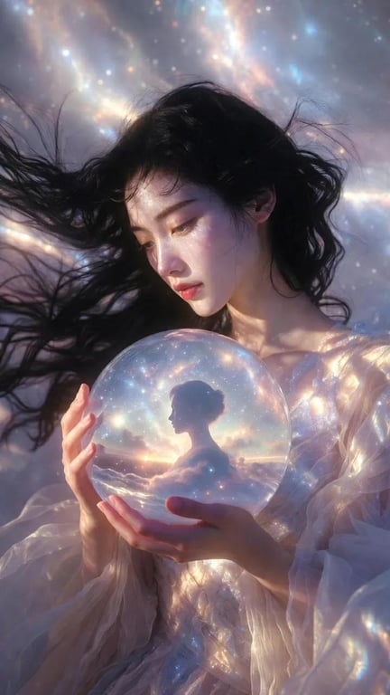 A detailed prompt for Gemini Nano Banana Pro to generate a cinematic vertical fashion editorial portrait (9:16) of a woman with long, floating black hair, wearing an ethereal haute couture gown. The image features a transparent crystal sphere containing a miniature luminous universe, set against a soft cosmic gradient background with ultra-realistic, dreamy lighting.