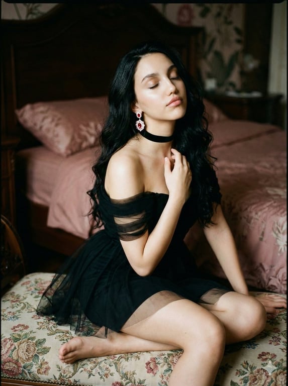 A detailed prompt for generating a breathtaking cinematic fine art portrait of a young European woman with closed eyes, wearing a black off-shoulder mini ensemble, set in a dimly lit sanctuary with moody, chiaroscuro lighting and 35mm film aesthetic.