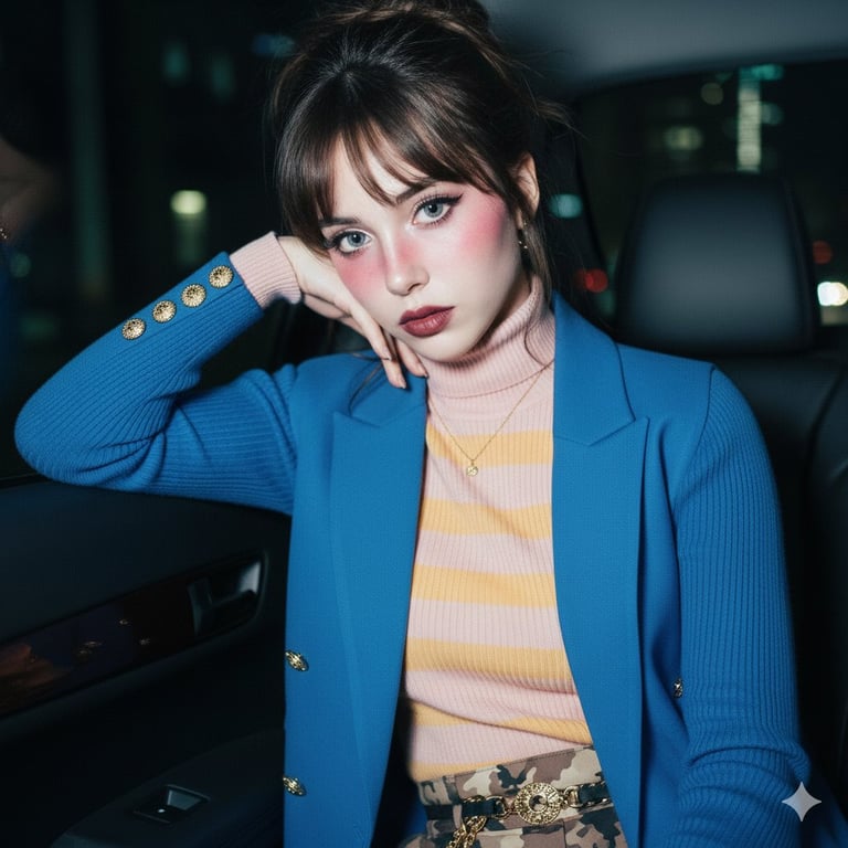 A detailed prompt for a high-fashion, moody portrait of a young woman with a doll-like aesthetic (large eyes, heavy blush) sitting in a car at night. It specifies complex layering of clothing (turtleneck under blazer), flash photography lighting, and a blurred city lights background (bokeh effect).
