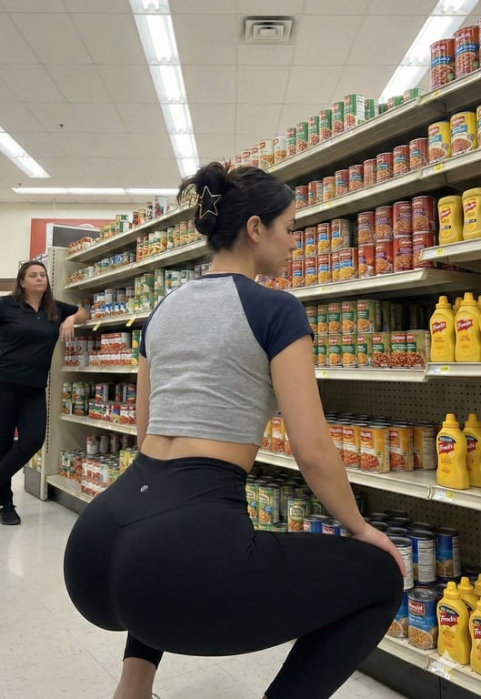 A highly specific JSON prompt for Nano Banana Pro detailing a vertical photograph of a young woman with an extremely exaggerated 'slim-thick' hourglass figure posing in a grocery store aisle. It mandates realistic skin texture, specific wardrobe (grey cropped tee, black leggings), and constraints like 'NO TATTOOS' and the inclusion of a second woman in the background.