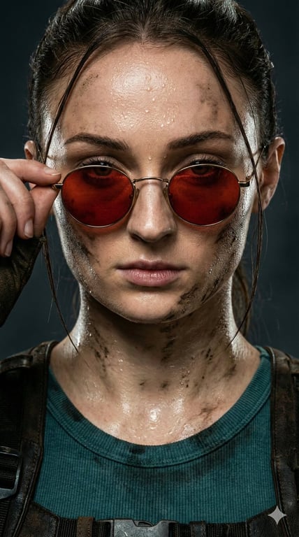 A highly detailed prompt for an extreme cinematic closeup portrait of Sophie Turner as Lara Croft. It focuses on visceral textures like sweat, mud, and grit on her skin, high-contrast lighting to emphasize facial contours, and technical details like an 85mm macro lens for razor-sharp focus on her fierce expression.