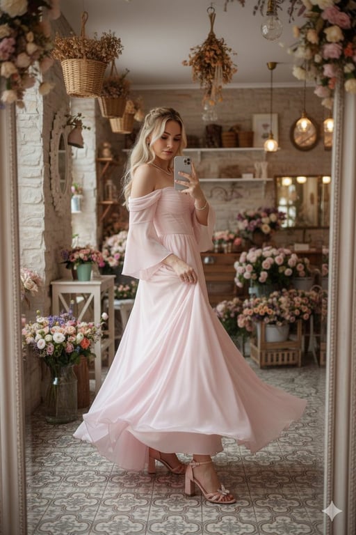 A detailed JSON prompt for generating a full-body mirror selfie of a woman in an elegant, pastel pink fairy-core gown and high-heeled sandals, set in a romantic European-style floral cafe. The prompt emphasizes strict adherence to a reference photo for facial identity and specific apparel details.