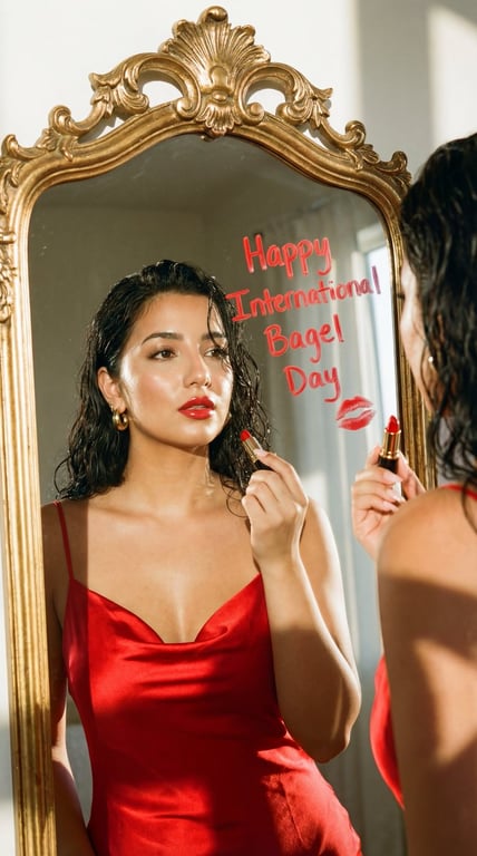 A high-priority prompt for generating a photorealistic fashion editorial portrait of a woman holding red lipstick in front of a vintage gold-framed mirror. The key feature is the text 'Happy International Bagel Day' written on the mirror in lipstick, combining a playful message with a sensual, confident aesthetic.