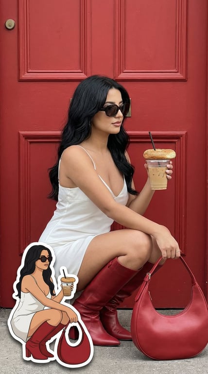 A complex JSON prompt requiring the generation of a photorealistic fashion editorial portrait of a woman (with specific pose, wardrobe, and props) alongside an exact 2D vector cartoon duplicate of the subject, ensuring precise mirroring of pose and details in the sticker overlay.