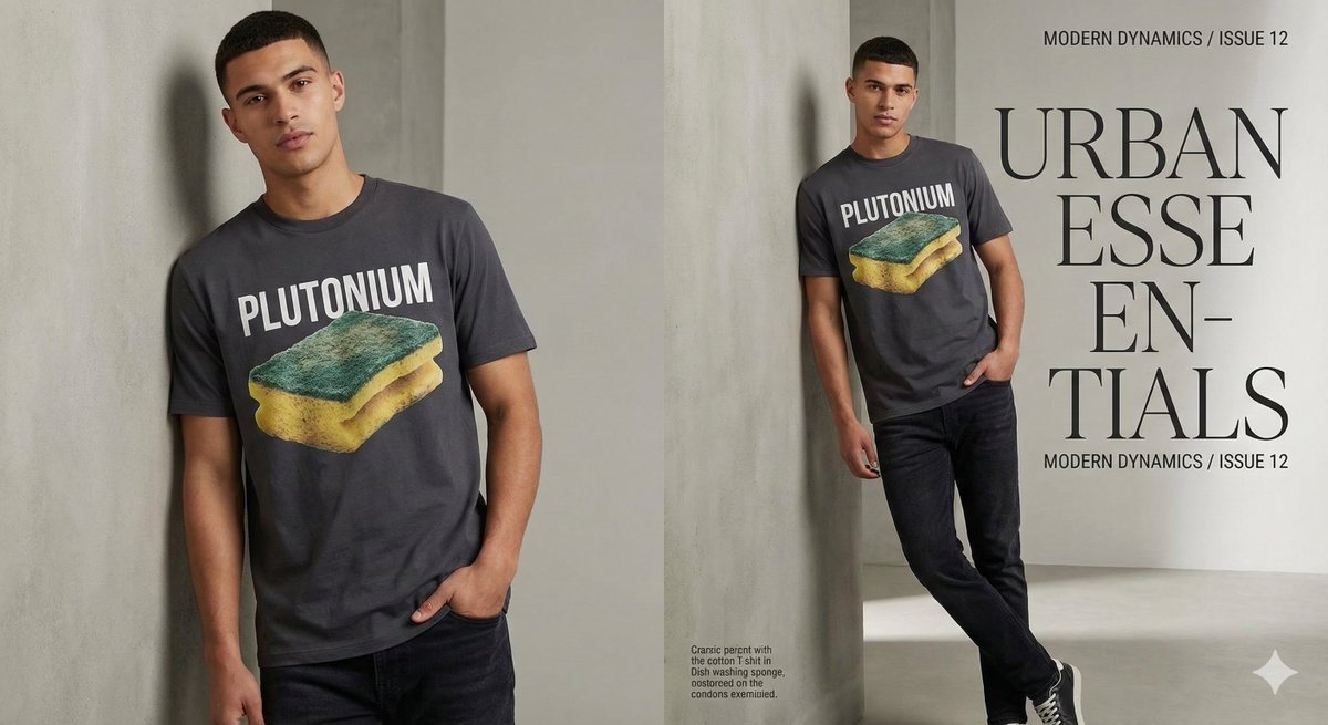 A prompt for Nano Banana Pro (Gemini 3.1 image generator) to create an image of a T-shirt designed like a kitchen sponge, featuring the word 'Error,' rendered in the style of a fashion magazine advertisement.