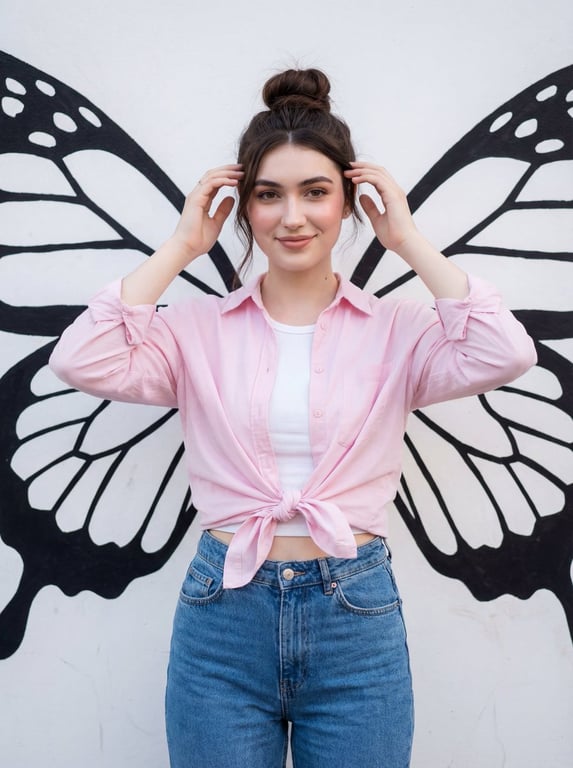 A detailed Gemini Nano Banana Pro prompt for generating a fashion portrait of a young woman in casual attire (pink shirt tied at the waist, jeans) against a painted wall mural featuring large black butterfly wings. The composition is designed to create an angelic or transformation illusion using soft, diffused lighting and a clean, stylish aesthetic.