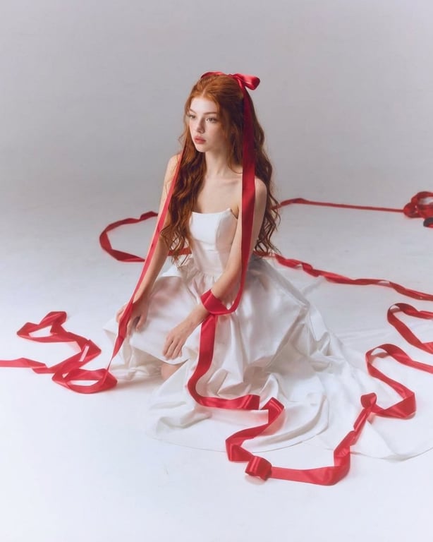 A prompt for generating a fine-art studio portrait of a woman in a white satin dress, emphasizing an ethereal, romantic, high-fashion aesthetic. The key visual element is long red silk ribbons trailing dramatically from her hair, creating fluid lines against a minimalist white backdrop.