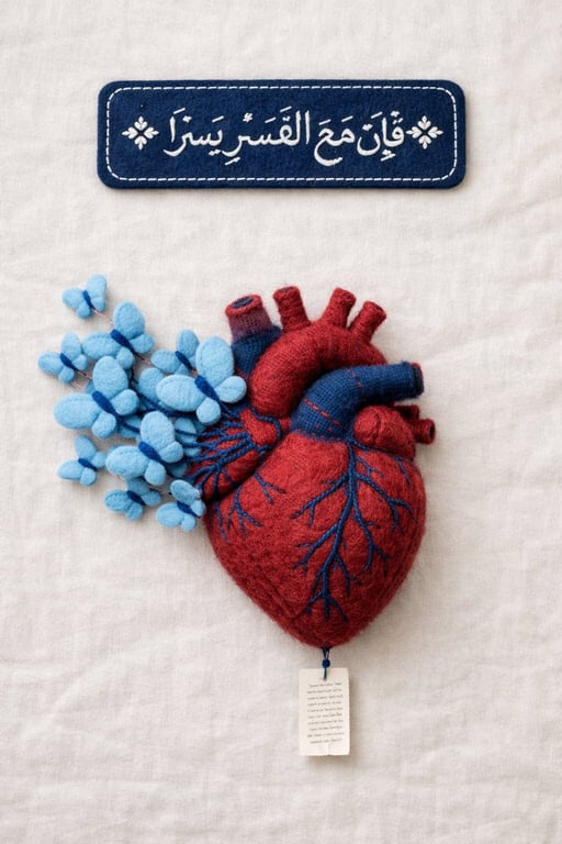 A detailed prompt for generating fine art textile photography in an 8K top-down flat lay view. The composition features a deep navy felt plaque with white embroidered Arabic calligraphy, a felted anatomical human heart, and light blue fabric butterflies emerging from the heart, all set on a soft off-white background.