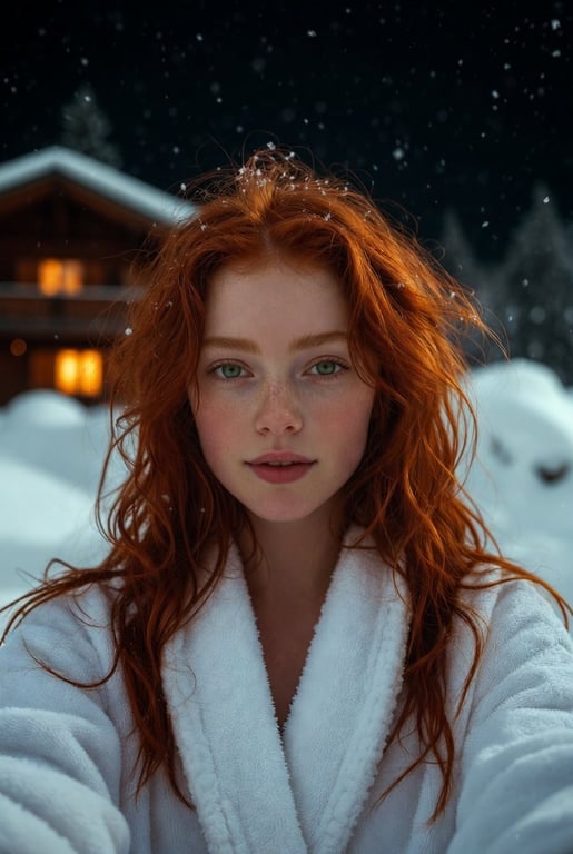 A highly detailed, technical prompt for Gemini Nano Banana Pro to generate an ultra-realistic, flash-lit selfie portrait of a young woman with copper-red hair outdoors at night in the snow, emphasizing hyper-realistic skin texture, detailed fabric, and mixed cold/warm lighting from an alpine chalet background.
