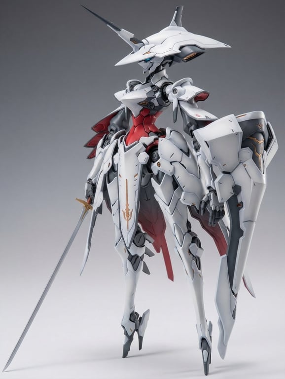 A prompt used with Nano Banana Pro to generate an image concept for a 1/7 scale plastic model kit of a 'Full Armor Mecha Girl' (FAMG-001 Aurelith). The design incorporates a 'Jingasa' (samurai hat) image for the head, derived from 'Warrior Mecha Girl' and 'Knight Mecha Girl' concepts.