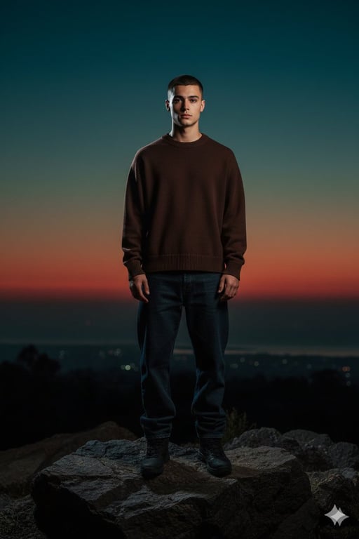 A prompt for generating a photorealistic, full-body vertical shot of a man standing on a rock during blue hour. It specifies using a reference image for the face, details the dark, structured outfit, and emphasizes dramatic frontal flash lighting against the warm sunset horizon.
