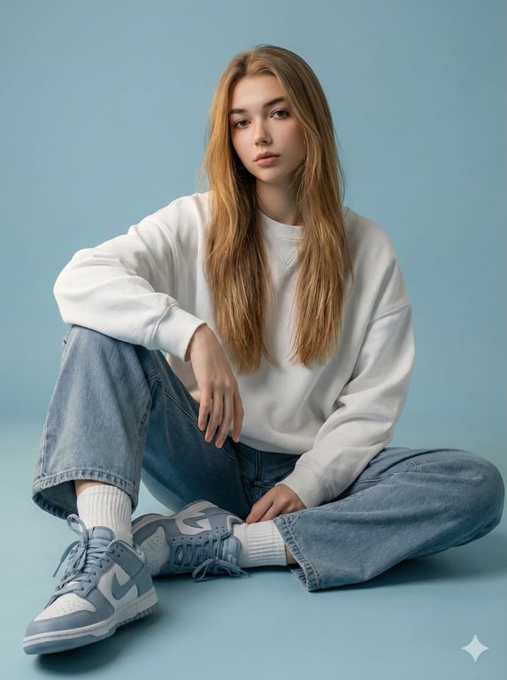 A detailed JSON prompt for generating a photorealistic, futuristic fashion editorial image of a woman seated in a studio. The prompt is highly focused on identity preservation, requiring the model to use the exact face, hairstyle, and expression from an uploaded reference photo while generating a specific outfit (oversized white sweatshirt, cloudy blue combat jeans) and soft cinematic lighting.