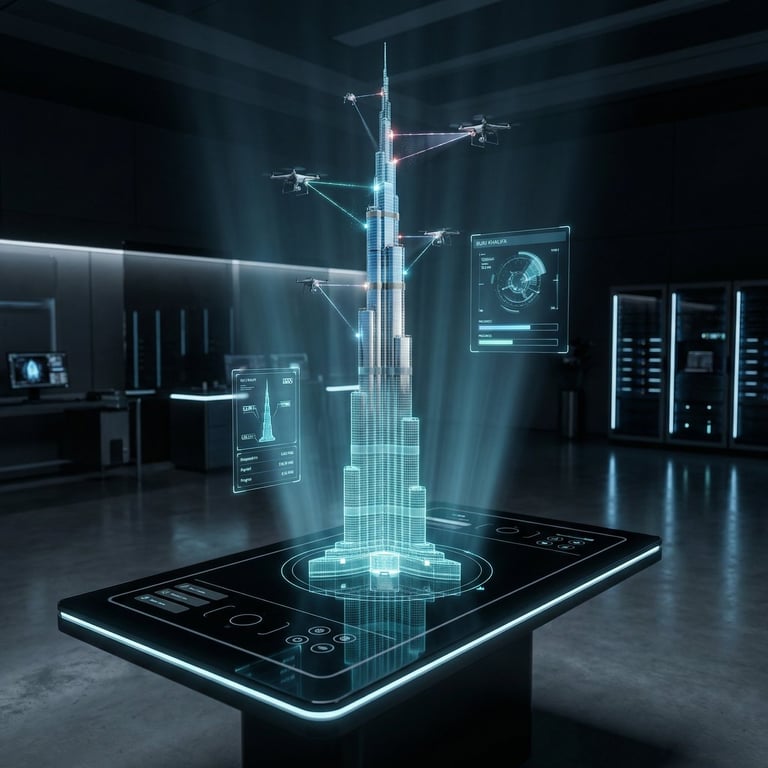 A detailed prompt for generating a futuristic, cinematic image of the Burj Khalifa architectural blueprint projected as a glowing, actively constructing hologram above a high-tech glass table. The prompt specifies the transition from wireframe to photorealistic structure, lighting (neon blue/cyan), and environment (minimal architectural lab).