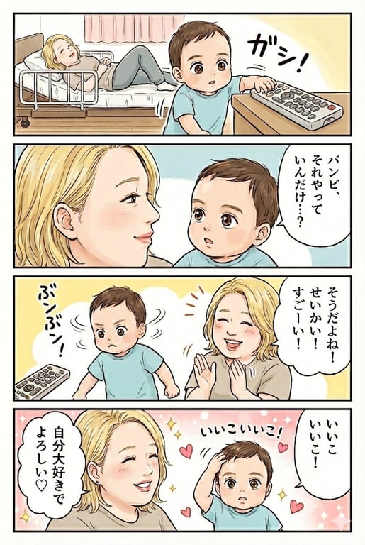 A 4-panel manga about daily life, titled 'Banbi & SMA Mom Remote Control Episode', created using Gemini's Nano Banana Pro. The user notes that while Japanese text conversion still has issues, the feature is very convenient.