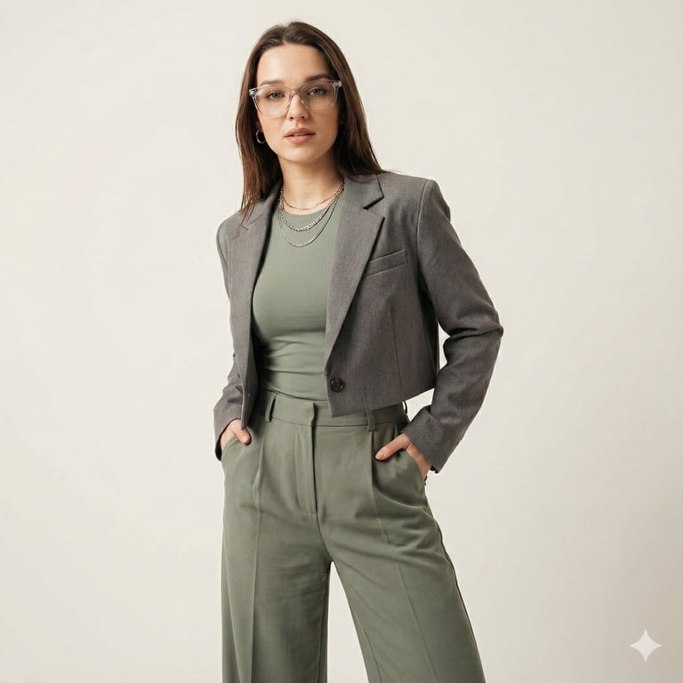A prompt for generating a modern, high-fashion studio portrait of a woman with a Gen-Z aesthetic. It requires the subject to be identical to a reference image and focuses on chic, trend-forward streetwear, minimal studio background, and soft, moody editorial lighting to highlight styling details.