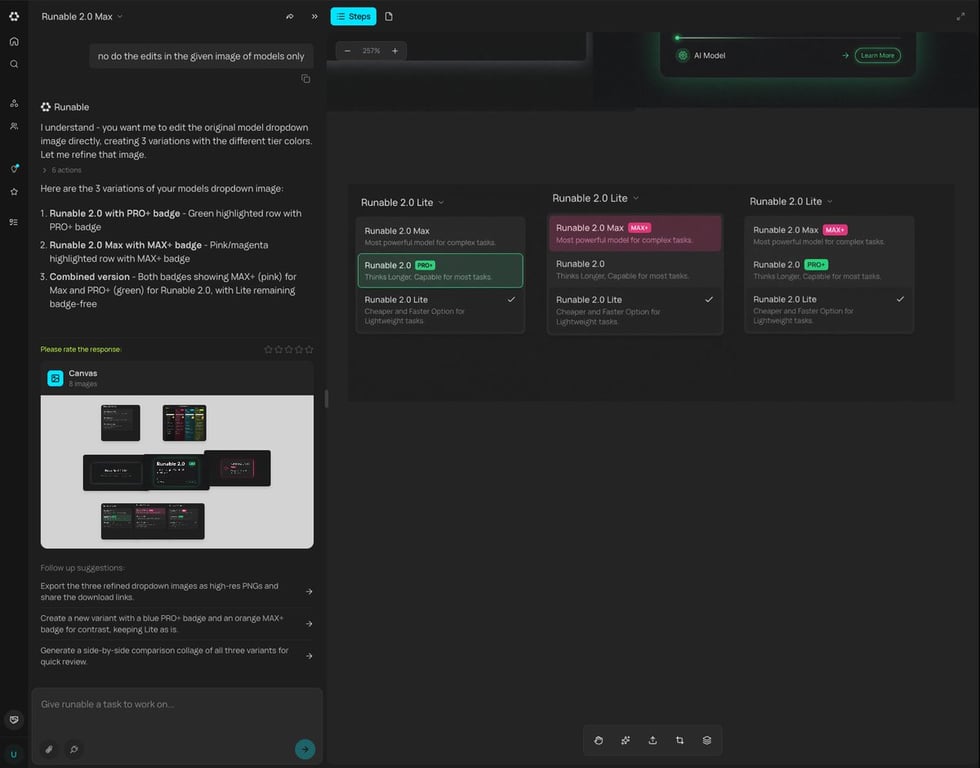 A prompt describing the ability to generate multiple different states or runnable modes for a design or application based on a single input, streamlining the design process.