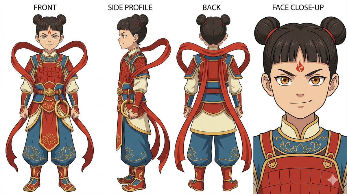 A prompt specifically designed for Nano Banana 2 to create a character turnaround sheet for Nezha in the style of Studio Ghibli, referencing an external image for the format.