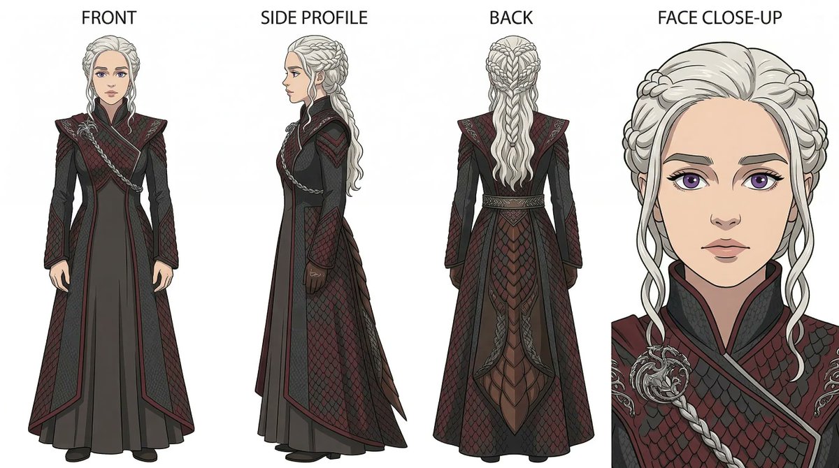 Two prompts for Nano Banana 2 to create images combining the Ghibli art style with Game of Thrones characters. The first prompt uses a reference image for character turnaround, and the second creates a scene with the characters.