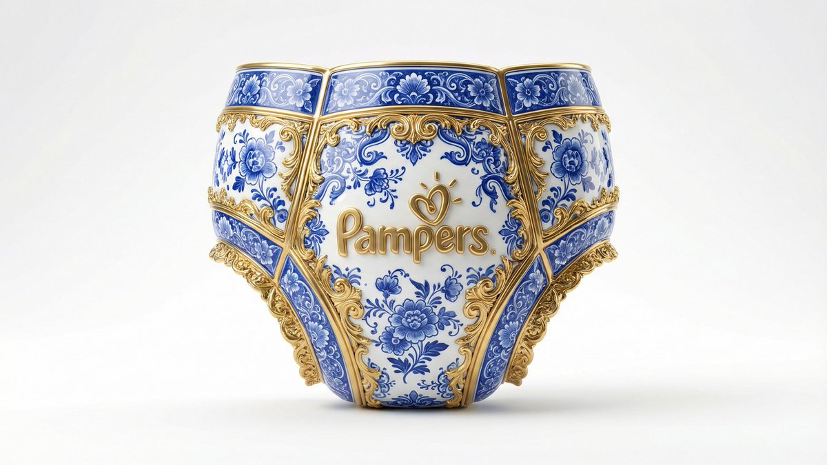 A short, descriptive prompt aiming to generate a signature product image in the style of Gilded Delftware, likely for a brand presentation.