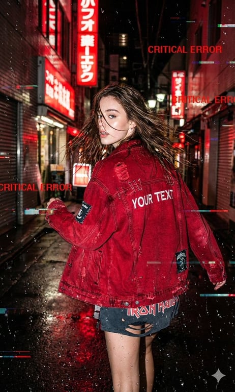 A raw, candid street-style prompt for generating an image of a subject running through a rain-soaked Neo-Tokyo alleyway. It focuses heavily on visual effects: raindrops on the lens, blurred red neon reflections, and heavy post-processing with 'Critical Error' text overlays and glitch artifacts, simulating flash photography and high contrast.