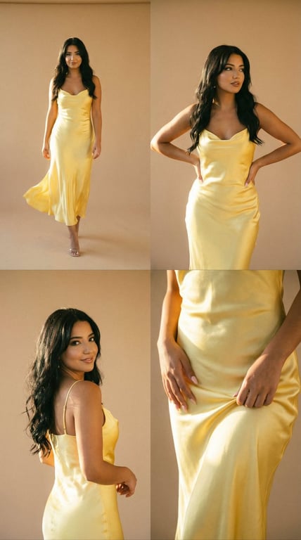 A complex, structured prompt for generating a four-panel fashion editorial collage featuring a woman in a butter yellow satin slip dress. The prompt specifies different framings, poses, and lighting conditions (all golden hour) for each panel, aiming for a vintage film aesthetic with high consistency.