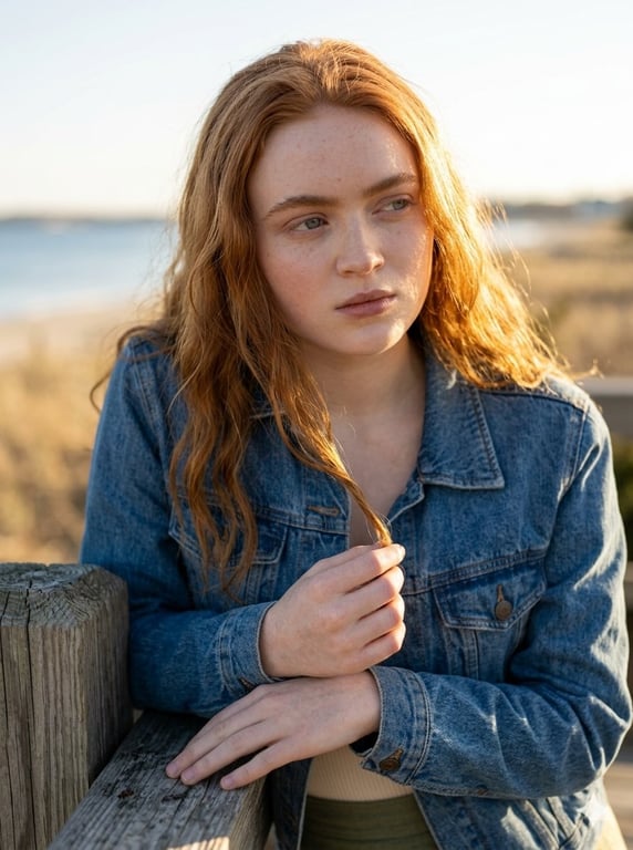 A structured JSON prompt for Google Nano Banana 2 to generate a photorealistic portrait of a young woman during golden hour. The prompt specifies subject details, clothing (denim jacket, ribbed top, linen skirt), pose, setting (wooden boardwalk near a beach), and technical specifications like shallow depth of field and 8k resolution.
