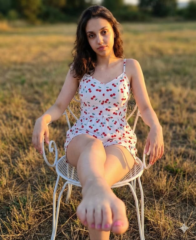 A Nano Banana Pro prompt for generating an image of a woman sitting on a white wire chair in a dry grassy field during golden hour, wearing a cherry-patterned romper, with a focus on her bare foot with pink toenail polish.