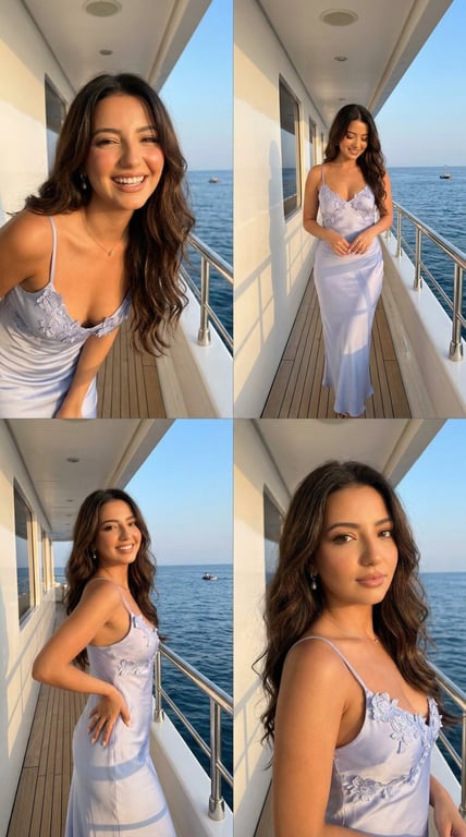 A structured JSON prompt for generating a 2x2 grid of candid, photorealistic luxury portraits of the same woman on a yacht during golden hour, ensuring identity preservation and changing only the pose and expression across the panels.