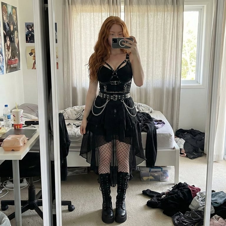 A highly detailed prompt for generating a realistic mirror selfie of a young woman in dark gothic street fashion. It emphasizes hyper-realistic details, including natural body proportions, fair skin with freckles, and a complex, chaotic 'lived-in' bedroom environment reflected sharply in the mirror, capturing a casual, candid aesthetic.