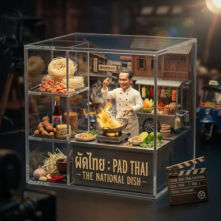 A complex, structured prompt instructing the AI to visualize a famous Asian dish as a 'gourmet collectible' cinematic still. The core concept is a transparent acrylic cube staging a frozen scene from a biographical film about the dish's creation, complete with a miniature inventor, film props (ingredients), and architectural details made from food. The prompt requires the AI to first study the dish's origin and cultural importance.