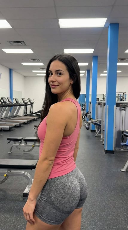A structured JSON prompt for generating a medium-full shot portrait of a fit woman posing in a gym, specifically looking back over her shoulder. Crucially, the prompt includes explicit instructions for strict adherence to an uploaded reference image for facial features and body proportions.