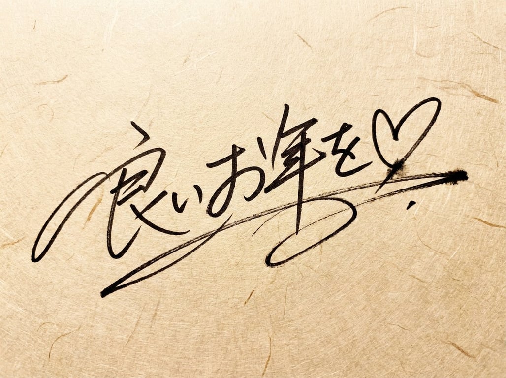 A prompt for generating a dynamic, artistic handwritten signature style text using a thin black marker. The text is a New Year's greeting, emphasizing fluidity, speed, and design over readability, with realistic textures like ink bleed on a pale Japanese paper background.