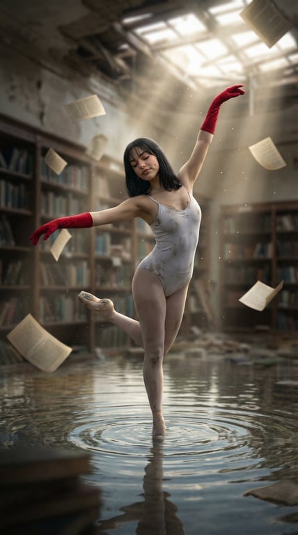 A highly detailed, structured prompt for generating a cinematic image of a ballerina performing an attitude derriere pose in a flooded, derelict library, emphasizing texture, lighting, and a melancholic atmosphere. This prompt uses the Flow structure of Nano Banana Pro.