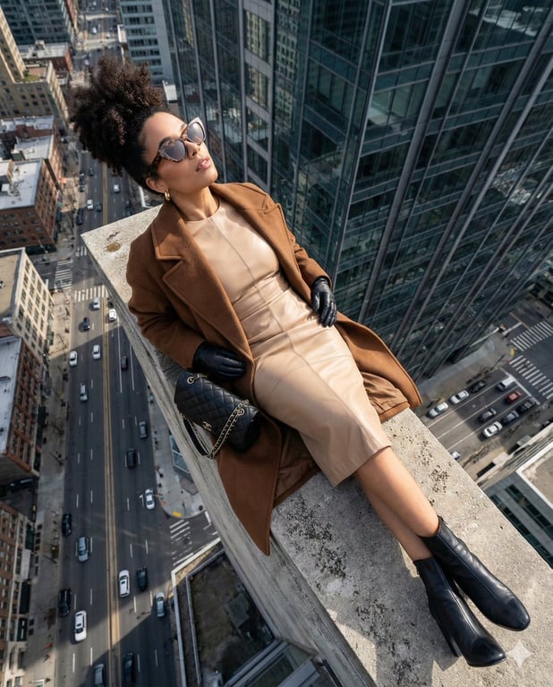 A highly detailed JSON prompt for generating an ultra-photorealistic fashion editorial image of a woman lying on a narrow concrete ledge of a skyscraper rooftop. It specifies a high-angle, steep downward tilt perspective, high contrast natural daylight, and detailed descriptions of her outfit (oversized wool coat, leather dress, cat-eye sunglasses) to create a daring, vertiginous urban scene.