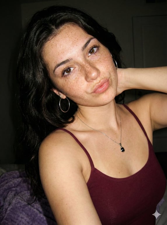 A structured JSON prompt for Gemini Nano Banana Pro to generate a close-up portrait/selfie in the 'baddie' aesthetic, featuring a young female subject with heavy freckles, glossy lips, and dark hair, wearing a maroon camisole. The key technical element is the direct on-camera flash, creating hard lighting and high contrast against a dark background, mimicking an early 2000s digital camera vibe.