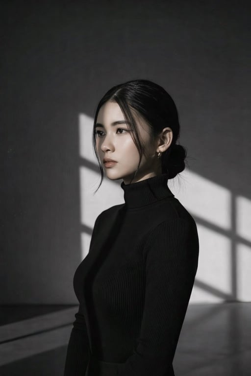 A prompt for generating a high-resolution black and white portrait of a girl wearing a black turtleneck and a Korean bun, set in a minimal studio with dramatic lighting that creates bold geometric shadows, resulting in a cinematic, high-contrast image.