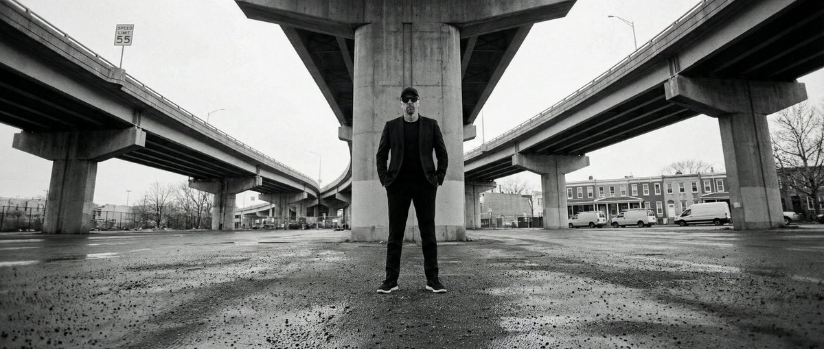 A detailed prompt for generating a high-contrast, black-and-white documentary photograph, scanned from analog film. It features a subject (identity locked via reference image) standing beneath a massive brutalist concrete highway interchange, emphasizing the scale of infrastructure and a cold, archival street-photography mood.
