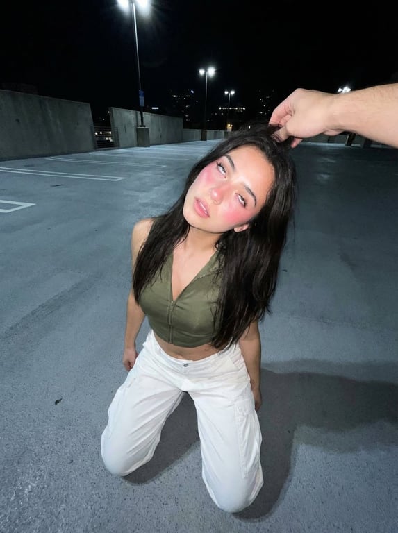 An extremely detailed, structured JSON prompt for Nano Banana Pro focused on image reproduction and precise pose geometry. It describes a young woman kneeling on asphalt, wearing specific clothing and heavy makeup, with her head being pulled back by an external hand. The prompt specifies high-angle, canted framing, and harsh, high-contrast artificial lighting consistent with a nighttime parking lot.