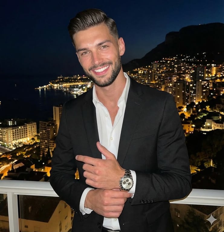 A highly detailed JSON-formatted prompt for Gemini Nano Banana Pro, focusing on generating a high-contrast, polished lifestyle portrait at night. The prompt meticulously defines composition, color profile (complementary warm/cool tones), and lighting (hard flash on the subject against ambient city lights in the background).