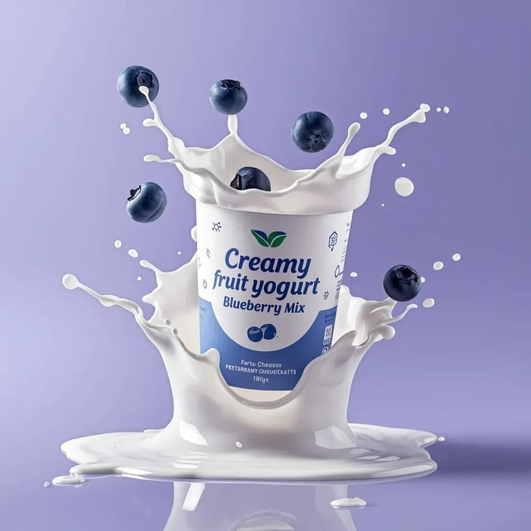 A detailed prompt for Nano Banana Pro focusing on generating ultra-realistic commercial product photography of a yogurt cup, emphasizing dynamic motion, milk splash explosion effects, specific packaging design, and professional studio lighting against a gradient backdrop.