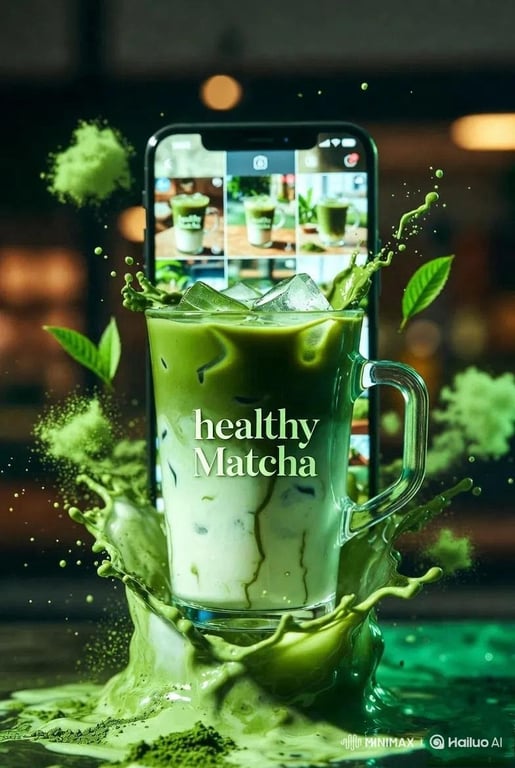 A prompt for Nano Banana 2 focusing on generating high-end commercial product photography of an iced matcha latte. It details the composition, including a dramatic liquid splash frozen mid-air, floating ingredients, cinematic lighting with green tones, and the inclusion of a smartphone displaying a social media feed in the background.