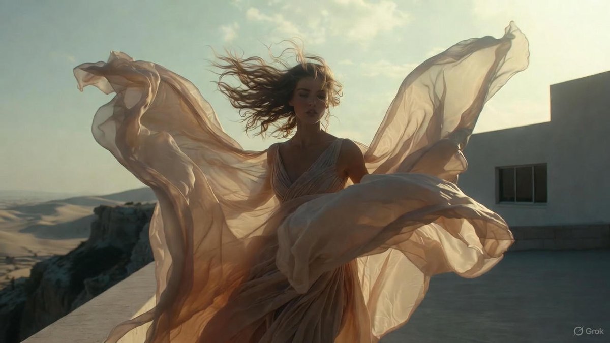 A prompt for Gemini Nano Banana Pro focused on generating a high-fashion cinematic image that captures dynamic movement. The goal is to freeze the motion of flowing fabric (gown/cape) and hair, lifted by wind, in a scenic location under soft golden hour lighting.