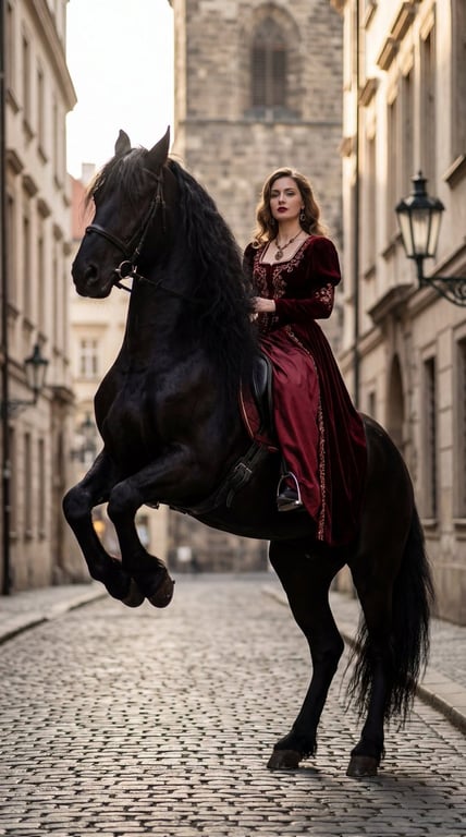A detailed prompt for generating an ultra-high-resolution, cinematic portrait of a high-fashion European model seated on a rearing black horse, set on a vintage European cobblestone street, emphasizing rich textures, dark red tones, and specific camera settings (50mm prime lens, 3:4 aspect ratio).
