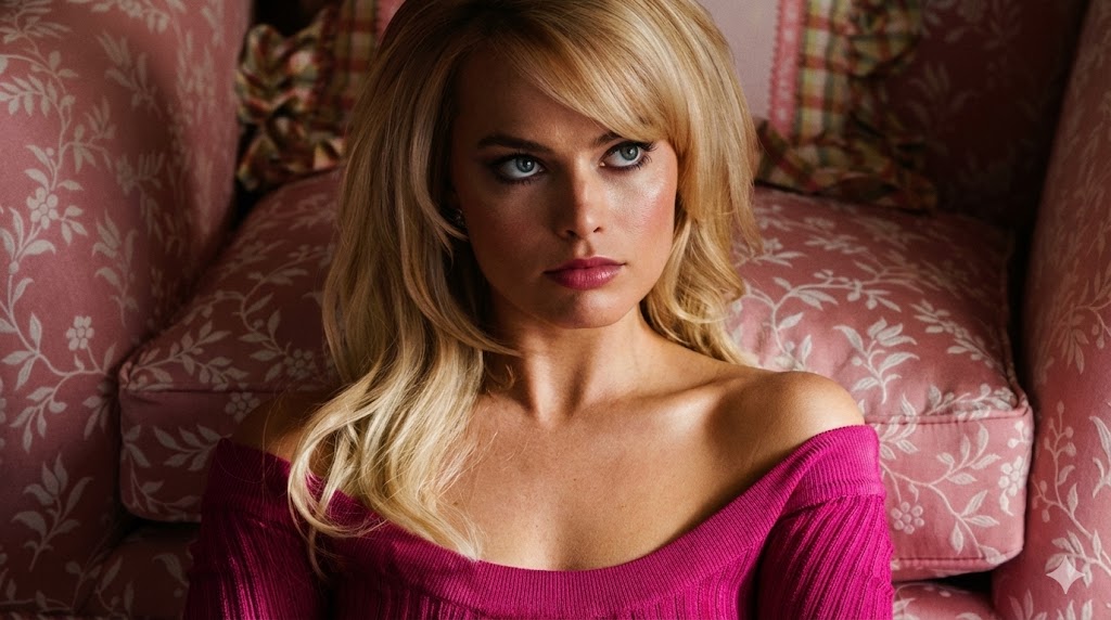 A prompt for generating a cinematic, high-fashion editorial portrait focusing on the subject's voluminous blonde hair, striking blue eyes, and intense upward gaze. It specifies a bright magenta, off-the-shoulder ribbed top, dramatic moody cinematic lighting, and a luxurious, opulent Vogue aesthetic, requiring an uploaded image for the subject's identity.