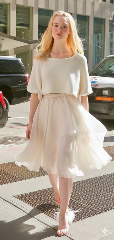 A detailed, cinematic prompt for generating a high-fashion street photography image. It features a blonde woman in a cream-white minimalist luxury ensemble (ribbed knit top and sheer asymmetric chiffon skirt) walking through a classic New York City street (SoHo/West Village). The prompt includes extensive technical specifications (85mm lens, f/1.8, cinematic framing, 8K resolution) to achieve a Vogue/Harper's Bazaar editorial aesthetic.