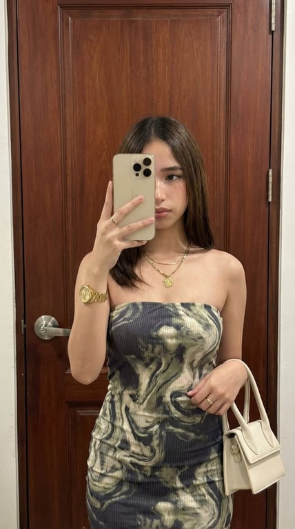 A highly detailed prompt for Nano Banana 2 focusing on generating a raw, high-fidelity mirror selfie with an iPhone simulation, emphasizing strict identity lock, realistic skin textures (micro-pores, vellus hair), and specific fashion details like a marble print dress and gold accessories.