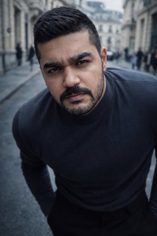 A highly constrained JSON prompt for generating a high-impact fashion editorial snapshot of a male model. It enforces strict identity preservation from an uploaded image, detailing the subject's confident expression, athletic build, dark clothing (mock neck top, tailored trousers), and a cool-toned, high-angle composition in a European street setting.
