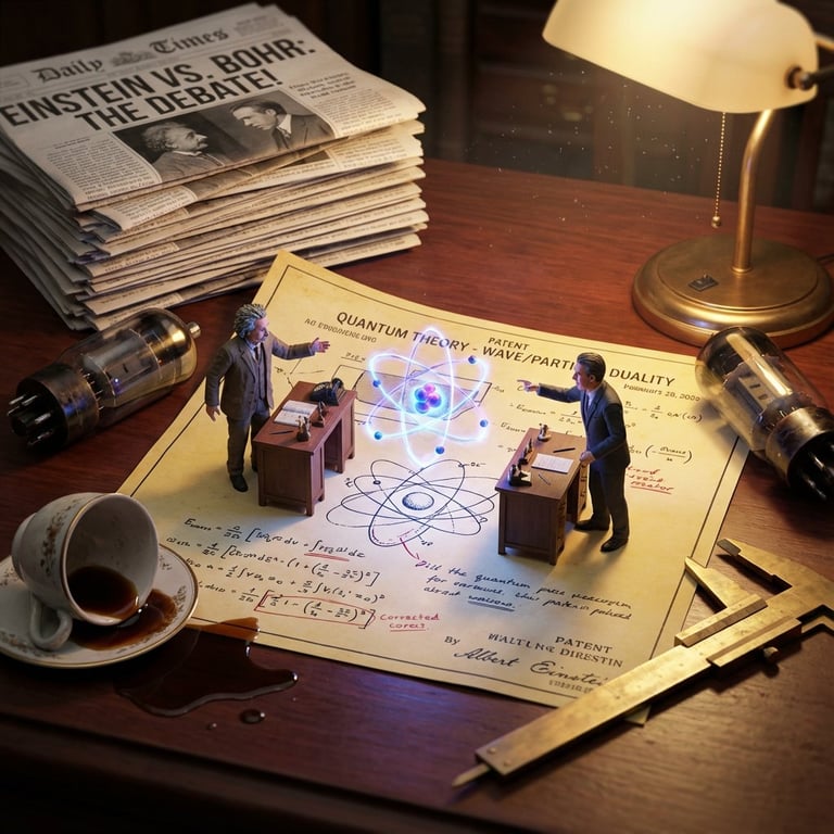A complex, multi-phase prompt for generating a hyper-realistic macro diorama image showing two historical scientific rivals (e.g., Einstein and a competitor) as tiny figurines battling over an invention on a giant patent diagram, emphasizing cinematic lighting and period-accurate clutter.