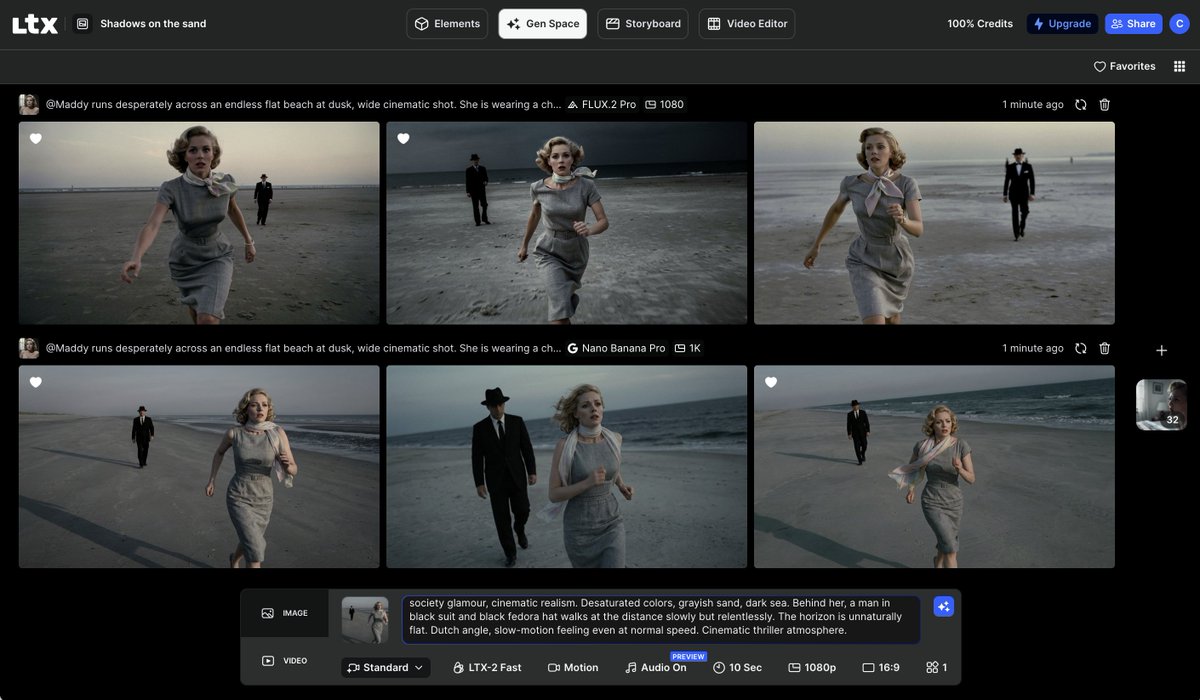A prompt for generating a cinematic thriller scene featuring a woman running desperately across a flat beach at dusk, pursued slowly but relentlessly by a man in a black suit and fedora. The prompt specifies the woman's 1950s high-society attire, desaturated colors, a Dutch angle, and a slow-motion feeling, inspired by Hitchcock's aesthetic.